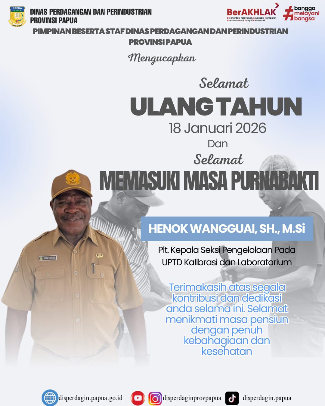 Salam sejahtera untuk kita semua. Puji dan syukur kita panjatkan ke hadirat Tuhan Yang Maha Esa yang selalu melimpahkan rahmat serta karunia-Nya kepada kita semua. Seiring kemajuan teknologi informasi dan kebutuhan akan informasi yang cepat, tepat, akurat dan akuntabel, Dinas Perdagangan dan Perindustrian Provinsi Papua juga mengupayakan Keterbukaan Informasi Publik melalui website ini. Diharapkan dengan adanya laman resmi Dinas Perdagangan dan Perindustrian Provinsi Papua yang dapat diakses oleh publik dengan cepat dan tepat ini, mampu memberikan informasi kepada pihak-pihak terkait yang membutuhkan informasi kedinasan terbaru. Selain hal di atas, yang tidak kalah penting adalah website Dinas Perdagangan dan Perindustrian Provinsi Papua diharapkan dapat menjadi jembatan penghubung untuk komunikasi dan penyebaran informasi antara masyarakat, lembaga yang bergerak di bidang perdagangan dan perindustrian, serta stake-holder terkait dengan Dinas Perdagangan dan Perindustrian Provinsi Papua. Akhirnya, marilah kita jadikan website ini sebagai media komunikasi dalam upaya membangun peradaban masyarakat Papua sehingga menjadi masyarakat yang berbudaya, cerdas, bermutu, dan mampu bersaing di era teknologi informasi dan komunikasi. Tuhan memberkati.