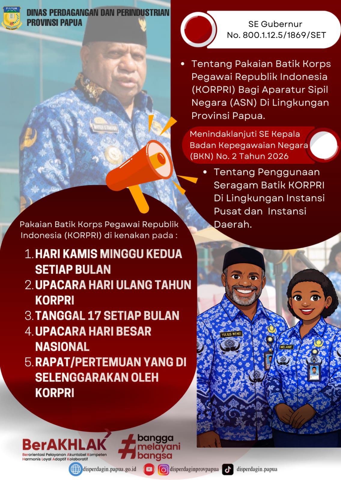 Salam sejahtera untuk kita semua. Puji dan syukur kita panjatkan ke hadirat Tuhan Yang Maha Esa yang selalu melimpahkan rahmat serta karunia-Nya kepada kita semua. Seiring kemajuan teknologi informasi dan kebutuhan akan informasi yang cepat, tepat, akurat dan akuntabel, Dinas Perdagangan dan Perindustrian Provinsi Papua juga mengupayakan Keterbukaan Informasi Publik melalui website ini. Diharapkan dengan adanya laman resmi Dinas Perdagangan dan Perindustrian Provinsi Papua yang dapat diak ses oleh publik dengan cepat dan tepat ini, mampu memberikan informasi kepada pihak-pihak terkait yang membutuhkan informasi kedinasan terbaru. Selain hal di atas, yang tidak kalah penting adalah website Dinas Perdagangan dan Perindustrian Provinsi Papua diharapkan dapat menjadi jembatan penghubung untuk komunikasi dan penyebaran informasi antara masyarakat, lembaga yang bergerak di bidang perdagangan dan perindustrian, serta stake-holder terkait dengan Dinas Perdagangan dan Perindustrian Provinsi Papua. Akhirnya, marilah kita jadikan website ini sebagai media komunikasi dalam upaya membangun peradaban masyarakat Papua sehingga menjadi masyarakat yang berbudaya, cerdas, bermutu, dan mampu bersaing di era teknologi informasi dan komunikasi. Tuhan memberkati. Read More